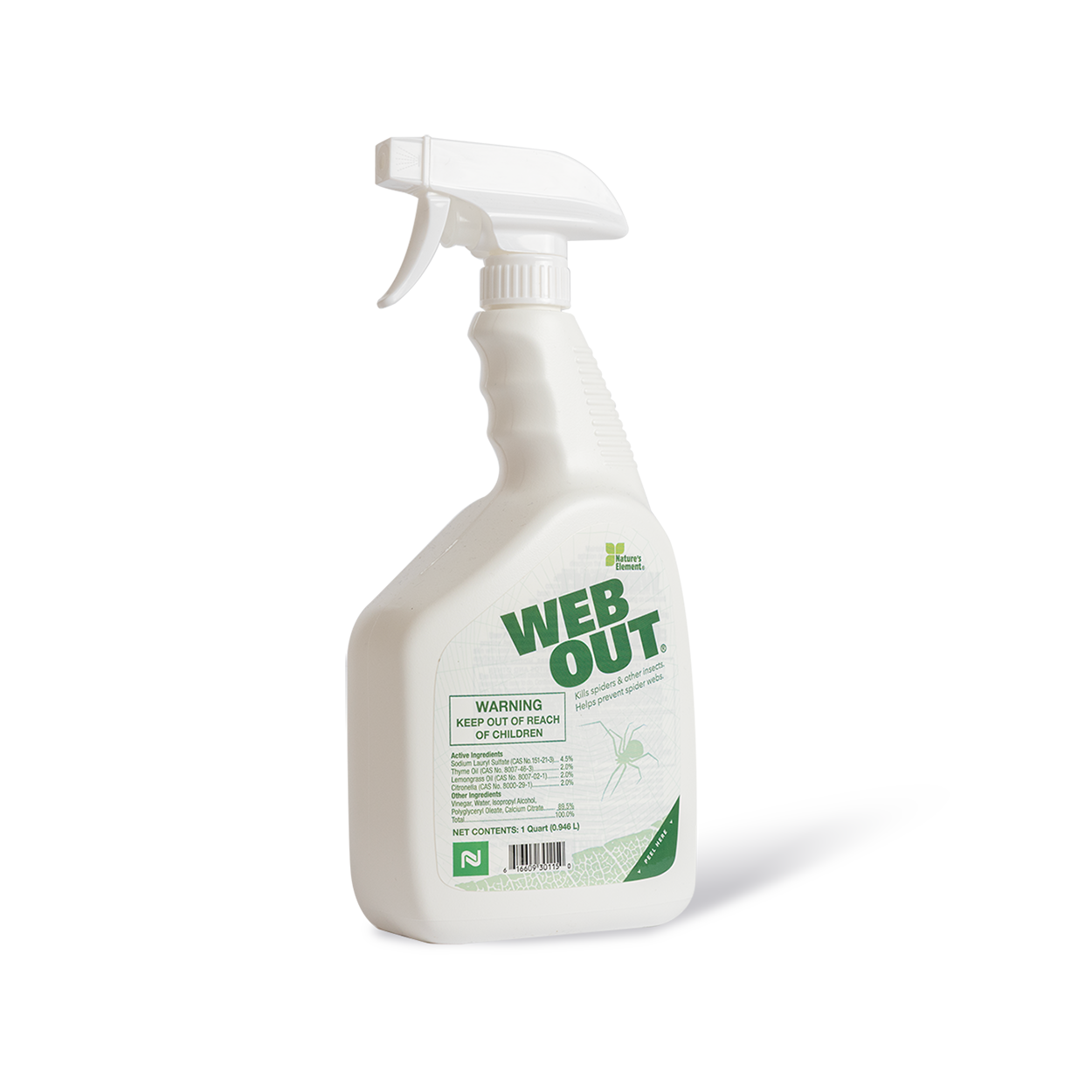 **Not for sale in New Mexico, Puerto Rico and South Dakota** Web Out tackles your spider problems, web and all. Web Out, part of our Nature’s Element line of EPA 25(b) exempt products, kills spiders and helps prevent spider webs from attaching to treated surfaces. Web Out can also be used as a contact pesticide to kill ants, crickets, mosquitoes, cockroaches, perimeter pest insects and other general pests. It can be applied as a surface application to kill and prevent surface fungus such as mildew. It can be applied to metal, wood, painted surfaces, brick, stucco, fiberglass, concrete, paneling and other surfaces.
